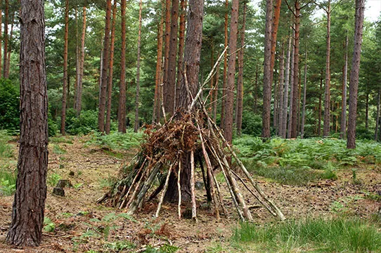 Vous pouvez également construire un appentis en plaçant une extrémité d’un long bâton sur une branche basse d’un arbre et en soutenant l’autre extrémité du bâton avec deux autres bâtons. Attachez les extrémités des bâtons ensemble avec vos lacets de bottes ou votre ceinture. Appuyez d’autres bâtons contre le bâton horizontal. Empilez ensuite des feuilles et d’autres débris forestiers contre les bâtons penchés jusqu’à ce que vous ayez un mur. Là encore, un feu sur le côté ouvert de l’appentis ajoutera beaucoup de chaleur à votre « pièce ».