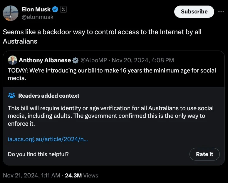 Ces méthodes impliqueraient soit la collecte de données biométriques, soit l’obligation pour les utilisateurs de fournir une preuve d’identité délivrée par le gouvernement. Ce que le propriétaire de X, Elon Musk, a résumé comme une « porte dérobée » qui affecterait tous les Australiens, dans la façon dont ils accèdent à Internet.