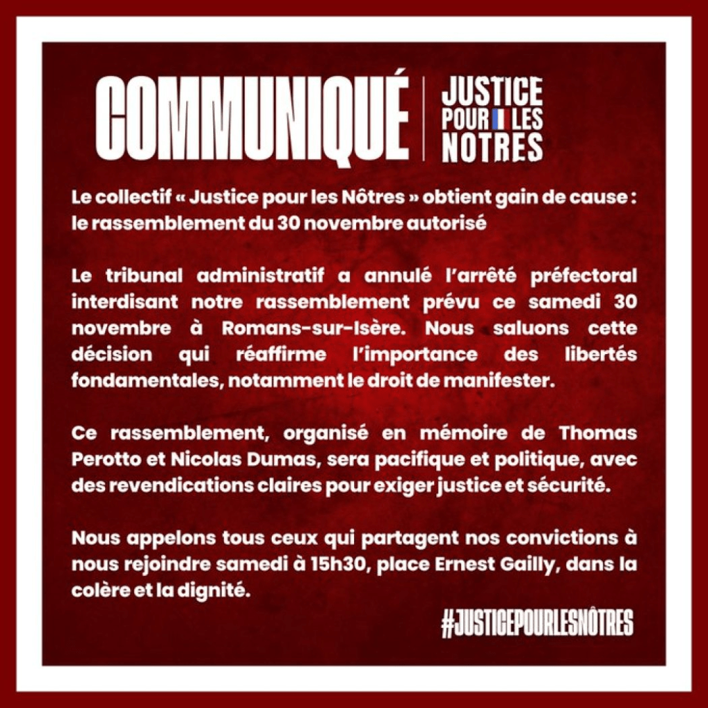 L’arrêté préfectoral affirmait que «le collectif Justice pour les nôtres développe la thèse du francocide et diffuse des propos discriminatoires envers les habitants du quartier de La Monnaie, lequel a été largement désigné comme abritant les auteurs des violences perpétrées à Crépol».