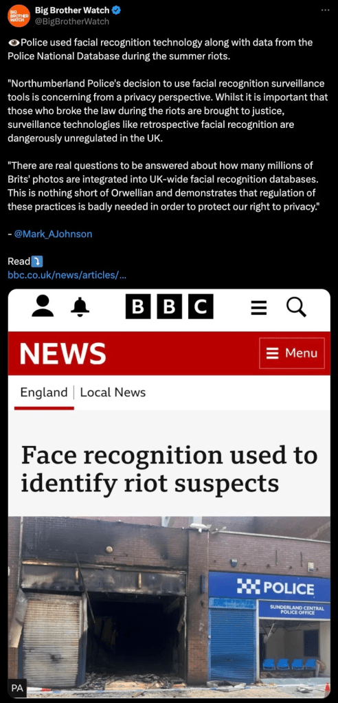 « Ce n’est rien de moins qu’orwellien et démontre que la réglementation de ces pratiques est absolument nécessaire pour protéger notre droit à la vie privée », a déclaré le groupe, en réaction à la divulgation des pratiques de la police de Northumbria, en particulier lors des émeutes de l’été.