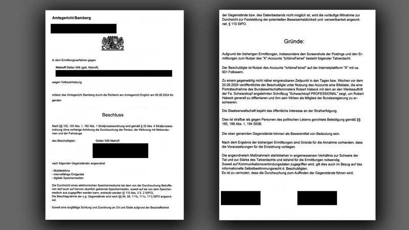 La décision du tribunal de district de Bamberg, qui a été remise à Niehoff, ordonne que toutes les pièces, les pièces adjacentes et les véhicules soient fouillés « sans audition préalable » à la recherche de téléphones portables, d’appareils connectés à Internet et de supports de stockage numériques et que tout ce qui est trouvé doit être fouillé. être confisqué.