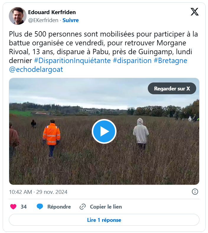Morgane Rivoal, 13 ans, est portée disparue depuis ce lundi 25 novembre à Pabu, près de Guingamp (Côtes-d’Armor). Malgré des moyens de recherche considérables mobilisés par les gendarmes, l’adolescente reste introuvable. Un appel à témoins a été lancé, tandis que ses proches espèrent un heureux dénouement.