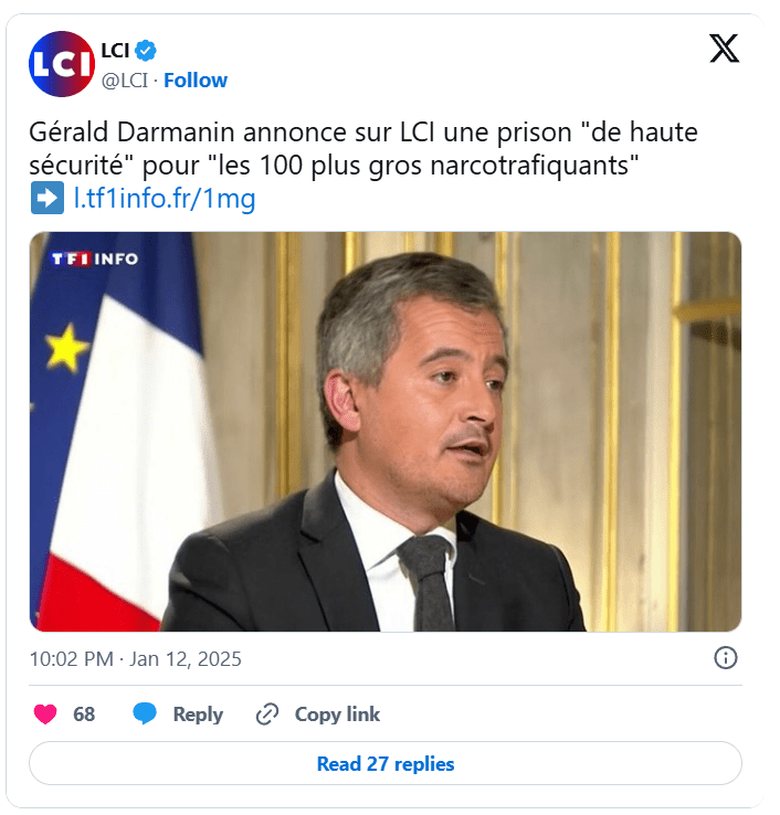 «Nous allons prendre une prison française, on va la vider des personnes qui y sont et on y mettra, puisqu’on l’aura totalement isolée, totalement sécurisée, avec des agents pénitentiaires particulièrement formés», les «cent plus gros narcotrafiquants», a annoncé Gérald Darmanin, sur la chaîne LCI.