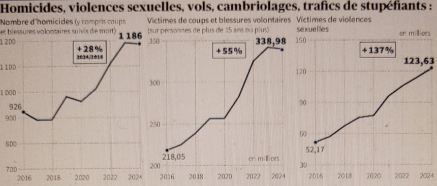 Les violences sexuelles ont également augmenté, avec 123 210 délits recensés en 2024, un chiffre qui sous-estime probablement l’ampleur réelle en raison du sous-signalement. Ce chiffre a grimpé de 137 % depuis 2016, la dernière année avant l’entrée en fonction du président Macron.