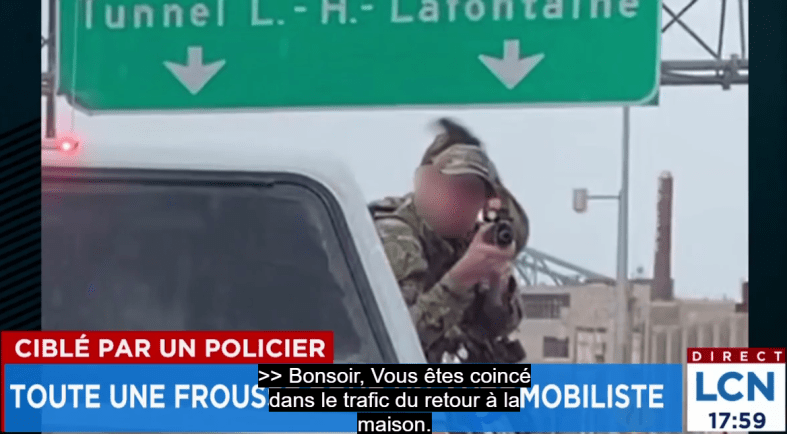 Un policier de la Sûreté du Québec (SQ) lourdement armé aurait pointé son arme sur un conducteur et sa conjointe en pleine heure de pointe, mardi dernier, au centre-ville de Montréal.
