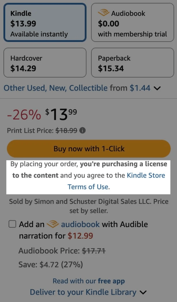 Les personnes qui choisissent d’acheter une version Kindle d’un livre obtiennent les détails de l’achat avant de passer à la caisse. L’un de ces détails indique, en gras, « (En passant la commande), vous achetez une licence pour le contenu. »
