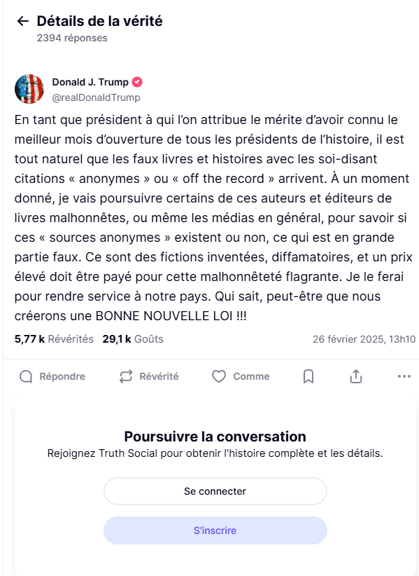«Je vais poursuivre en justice certains de ces auteurs et éditeurs de livres malhonnêtes, ou même les médias en général, pour savoir si ces « sources anonymes » existent ou non», a-t-il écrit sur sa plateforme Truth Social, ajoutant: «Qui sait, nous pourrons peut-être créer une NOUVELLE LOI!».