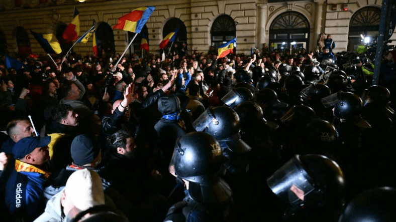« L’Europe est désormais une dictature, la Roumanie est sous la tyrannie », a déclaré Călin Georgescu, alors que ses partisans, gazés lacrymogènes, affrontaient la police anti-émeute.