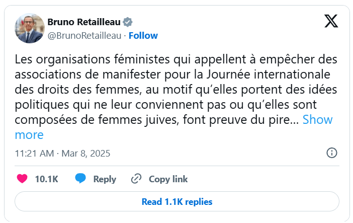 Le ministre de l’Intérieur Bruno Retailleau, qui avait assuré il y a quelques semaines le collectif Némésis de son soutien avant de se rétracter , a cette fois critiqué l’exclusion de Némésis sur X. Il a dénoncé le sectarisme de la manifestation officielle et ses « méthodes néo-totalitaires ».