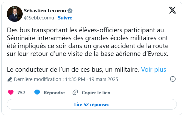 « Des bus transportant les élèves-officiers participant au Séminaire interarmées des grandes écoles militaires ont été impliqués ce soir dans un grave accident de la route sur leur retour d’une visite de la base aérienne d’Evreux », indique le ministre des Armées, Sébastien Lecornu, sur X, confirmant une information de 78actu.