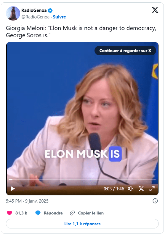 Elon Musk a répondu à l’échange sur les réseaux sociaux avec humour, en utilisant un mème pour peser sur le sujet. Dans un autre tweet, Musk a salué la position de Meloni, soulignant indirectement ses critiques constantes à l’égard de Soros, qu’il a accusé de saper les processus démocratiques à l’échelle mondiale. Musk a également partagé un tweet avec la légende « Et Soros est en train d’être vaincu », en lien avec son commentaire précédent.