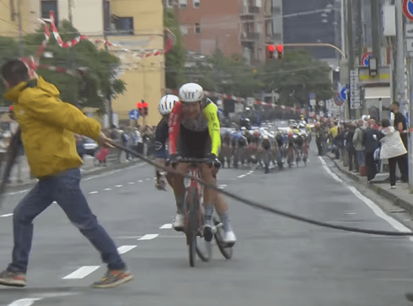 Ceux-ci ont déployé une banderole, des rubans et même une corde. Il a fallu du sang-froid aux deux coureurs pour éviter la chute. “D’un coup, j’ai vu un gars devant moi et je ne savais pas quoi faire”, souffle le Néerlandais de la formation Intermarché-Wanty.