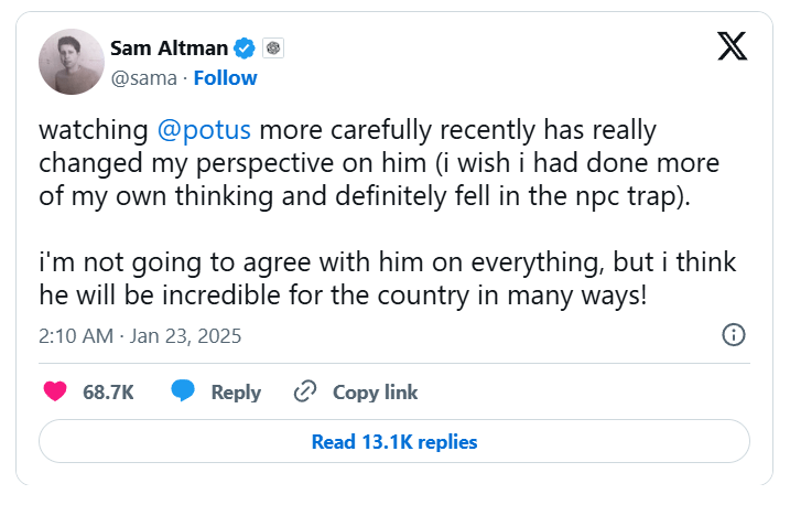 Même les milliardaires de la technologie comme Sam Altman (PDG d’OpenAI) — autrefois un libéral loyal et partisan de Biden, membre de la communauté LGBTQ — se sont joints à la fête :