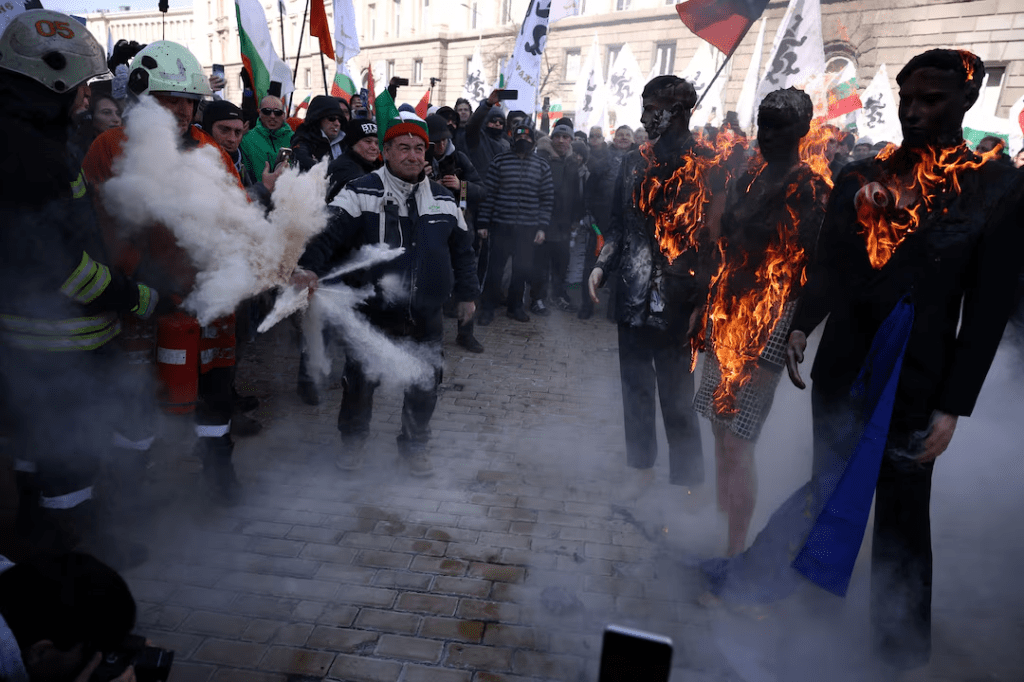 Les manifestants anti-gouvernementaux, scandant « Démission » et « Non à l’euro », ont jeté de la peinture rouge, des pétards et des cocktails Molotov sur le bâtiment de l’UE dans la capitale Sofia, mettant le feu à la porte d’entrée avant que la police ne les repousse.