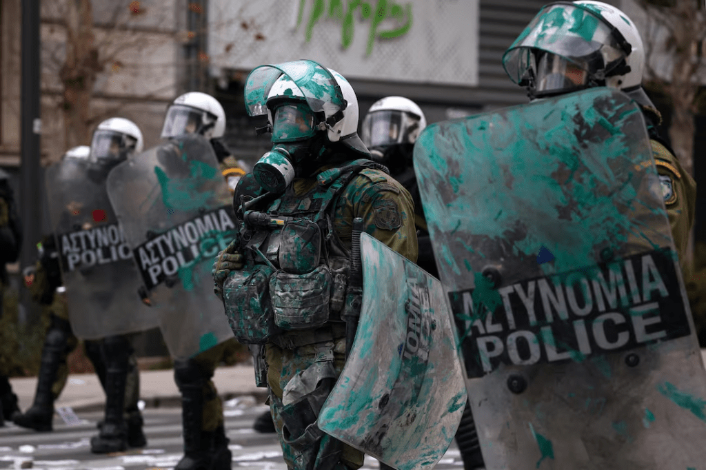ATHENES, 28 février (Reuters) – Des manifestants ont lancé des cocktails Molotov et incendié des poubelles vendredi à Athènes, alors que des centaines de milliers de Grecs étaient en grève et sont descendus dans la rue pour manifester à l’échelle nationale à l’occasion du deuxième anniversaire de l’accident ferroviaire le plus meurtrier du pays.