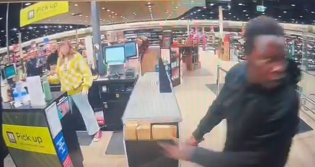On peut ensuite le voir agiter une énorme machette vers les caissiers et les agents de sécurité près des caisses avant de fuir le magasin après avoir été interrompu par la sécurité.