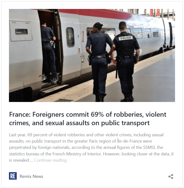 Remix News a analysé ces données à l’époque et a découvert que les migrants africains étaient responsables de 52 % de ces crimes, alors qu’ils ne représentent que 3,2 % de la population française.