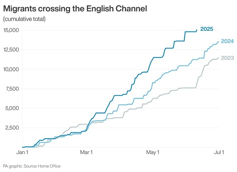 Les données du ministère de l’Intérieur montrent le nombre total cumulé de migrants ayant traversé la Manche jusqu’à présent cette année BUREAU À DOMICILE/PA
