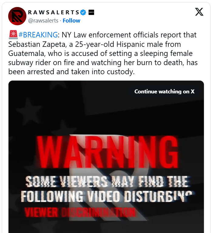 Un « migrant » originaire du Guatemala a été arrêté pour avoir tué une femme en l’incendiant alors qu’elle dormait dans un wagon de métro à New York ce week-end, selon les rapports.