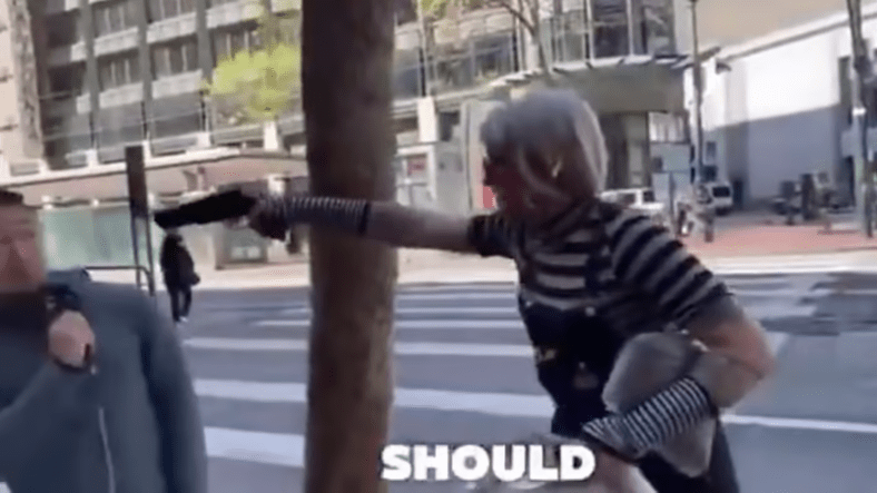 Un prédicateur de rue condamnant l’idéologie transgenre sur un trottoir a été confronté à une personne transgenre qui l’a menacé avec une arme de poing, dans une démonstration choquante de violence de gauche.
